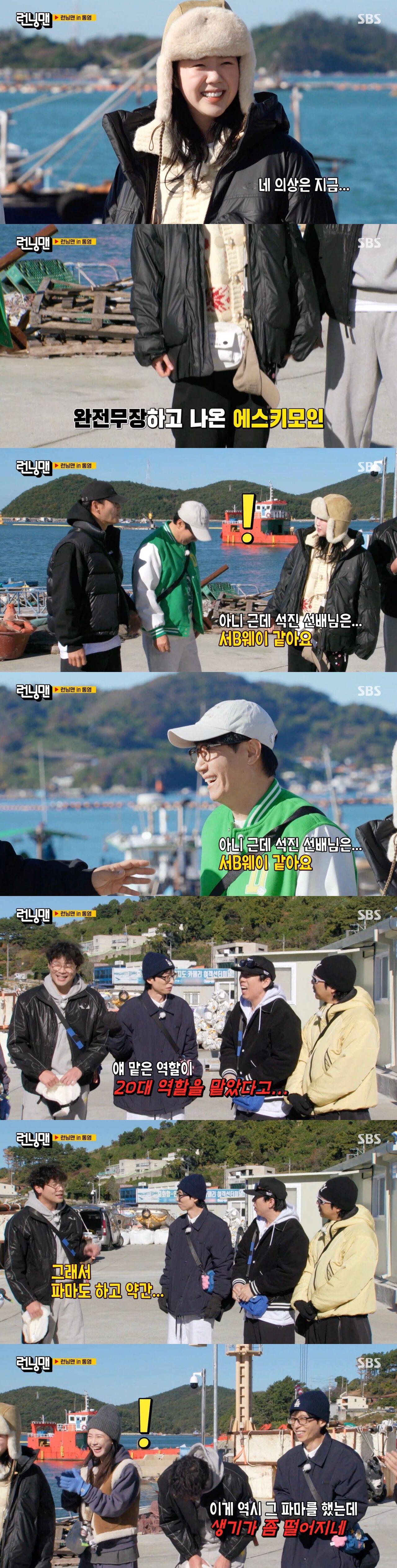이날 방송에서 멤버들은 완전무장을 하고 등장한 지예은에 "네 의상은 지금 시베리아야"라며 웃었다.