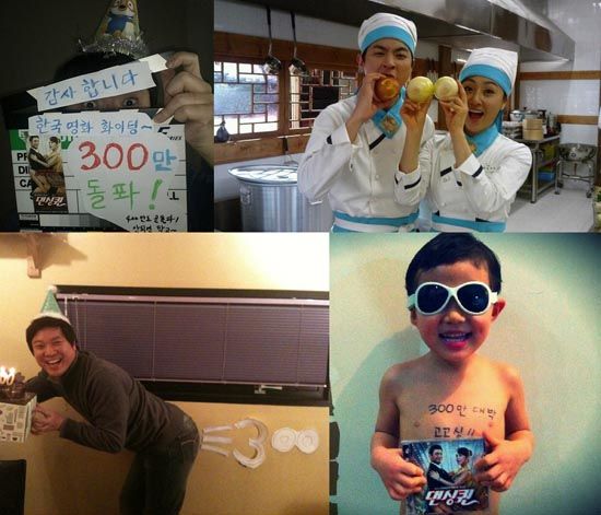 평소 점잖기로 유명한 이석훈 감독도 파격변신(?)으로 코믹 인증샷 릴레이에 동참했다. 뽀로로 고깔모자에 감독답게 슬레이트에 직접 손 글씨로 쓴 문구를 붙이고 열린 슬레이트 사이로 안경 벗은 큰 눈을 깜짝 드러내며 300만 돌파의 기쁨을 나눴다.