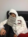 사진 속 이홍기는 흰 후드에 빨간 트레이닝 바지를 입고 소파에 편하게 앉아 있다. 또한 가죽으로 된 받침대에 얼굴을 기대고 잠이 든 모습이다.