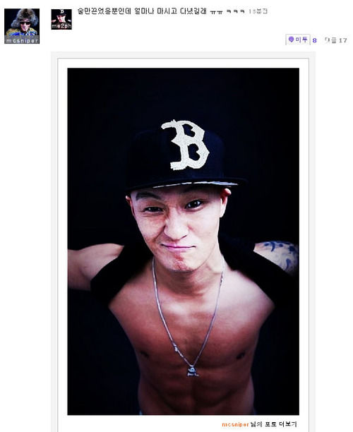 MC스나이퍼는 최근 자신의 미투데이를 통해 "난 평균 한달에 28일정도 술을 마신다 그중 20일은 만취할때까지 마신다. 술을 사랑한다 그래서 난 늘 통통한 모습이었다 다이어트엔 술이 최악이라는 말에 약 7일간 재킷 촬영을 위해 술을 끊었다 그냥 일주일간 술만 끊었을 뿐이다"라는 글과 사진 한 장을 게재했다.