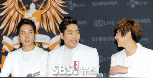 [SBS SBS연예뉴스 l 김현철 기자] 그룹 신화의 에릭-혜성이 25일 오후 서울 올림픽공원 체조경기장에서 열리는 그룹 신화 14주년 콘서트 '더 리턴' 기자회견에서 이야기를 나누고 있다.