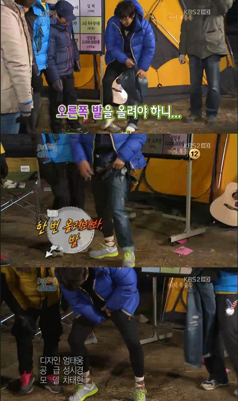 25일 방송된 '1박 2일'에서는 저녁 복불복으로 고무줄 놀이가 선택됐다. 눈높이의 고무줄을 점프없이 발로 걸어내리면 성공하는 미션에 차태현은 다리가 짧아 고심하는 모습을 보였다. 입고 있는 청바지 때문에 다리가 잘 벌어지지 않았던 것.