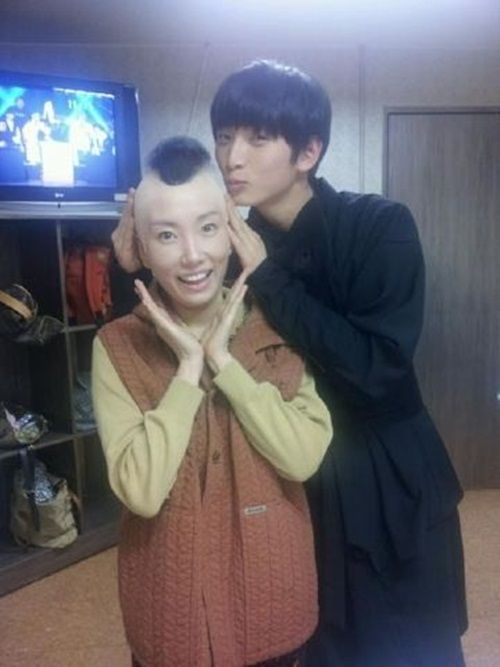 사진 속 정경미는 머리 좌우를 삭발한 일명 모히칸 컷 분장을 하고 있는 모습. 정진운은 이모뻘 되는 정경미의 머리에 키스를 하는 듯한 포즈로 여자 팬들의 마음을 설레게 하고 있다.