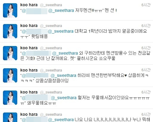 구하라는 팬들의 글에 일일히 화답하며 "저는 우울해서 잠이 안 와요"라는 팬에게는 "왜 우울해요"라며 위로를, "하라 씨, 멘션 한 번 부탁해요"라는 글에는 "상콤상큼쌍큼 아잉"이라며 애교를, "와, 구하라한테 멘션 받을 수 있는 천금같은 기회. 하지만 난 잘거에요 쳇"이라는 글에는 "쿨하시군요"라며 시크한 매력을 뽐냈다.