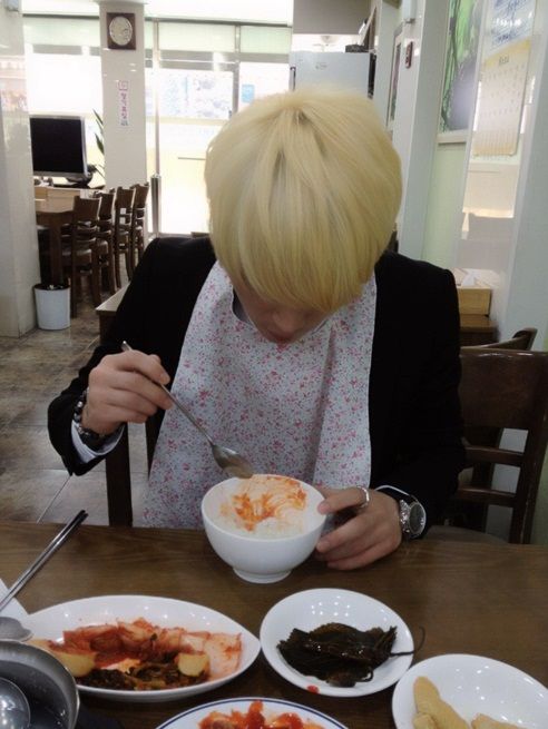 사진 속 김재중은 하얀 바탕에 분홍색 무늬가 있는 턱받이를 하고 고개를 푹 숙인 채 식사에 열중하고 있다.