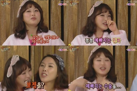 29일 오후 11시 15분 방송된 KBS 2TV '해피투게더3'에 출연한 심진화가 결혼 후 살이쪘다는 소식과 함께 보정 사실도 솔직하게 털어놨다.
