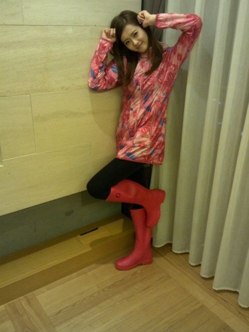 사진 속 고아라는 분홍색 계열의 레인코트를 걸치고 옷 색깔과 딱 맞는 분홍색 레인부츠를 신은 채 사진을 찍고 있다. 양 손을 머리에 올리며 귀엽게 애교를 부리는 모습이 인상적이다.