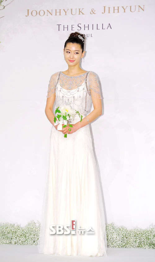 [SBS SBS연예뉴스 l 김현철 기자] 배우 전지현이 13일 오후 서울 장충동 신라호텔에서 열린 최준혁씨와 결혼식 전 기자회견에서 포즈를 취하고 있다.
