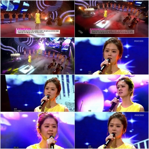 4년 만의 컴백 무대 위에서 아름답고 절제된 여성미를 보여주고 있는 장나라가 내추럴한 긴 웨이브 헤어를 단정하게 묶고 노란색 짧은 민소매 원피스를 입어 달달한 '노란 봄 처녀'의 모습을 연출했다.