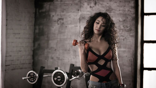 스토리온 '다이어트워 6' MC 한고은은 섹시 피트니스 영상에서 피트니스웨어 차림으로 아령을 들거나 스트레칭을 하면서 건강미를 발산하고 있다.