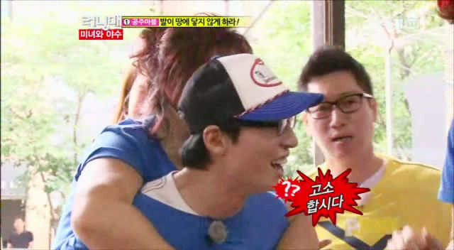 유재석은 노사연을 업고 굉장히 힘들어 했다. 업은 자세를 다잡기 위해 유재석은 몸을 움직였고, 이 때 뒤에 송지효를 업고 있던 김종국이 봉변을 당했다. 노사연의 엉덩이가 김종국의 얼굴을 때린 것.
