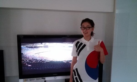 배우 박진희가 태극기 무늬 원피스를 입은 채 2012 런던 올림픽에 출전한 대한민국 대표팀을 응원해 눈길을 끌고 있다.