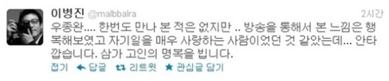 이병진은 16일 자신의 트위터에 "우종완… 한 번도 만나 본 적은 없지만…. 방송을 통해서 본 느낌은 행복해보였고 자기 일을 매우 사랑하는 사람이었던 것 같았는데…. 안타깝습니다. 삼가 고인의 명복을 빕니다"라는 글을 남겼다. 방송에서는 밝은 모습으로 웃음을 안겨줬던 그의 사망 소식에 많은 네티즌 역시 안타까워하며 애도를 표하고 있다.