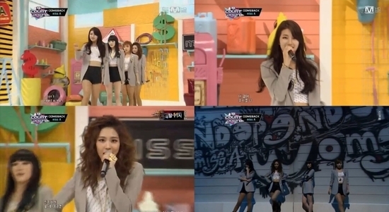 미쓰에이는 18일 오후 방송된 엠넷 '엠카운트다운'을 통해 컴백 무대를 갖고 새 앨범 타이틀곡 '남자없이 잘 살아'를 열창했다.