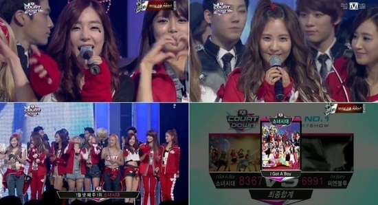 소녀시대는 24일 방송된 '엠카운트다운'에서 밴드 씨엔블루를 제치고 1위에 올랐다.