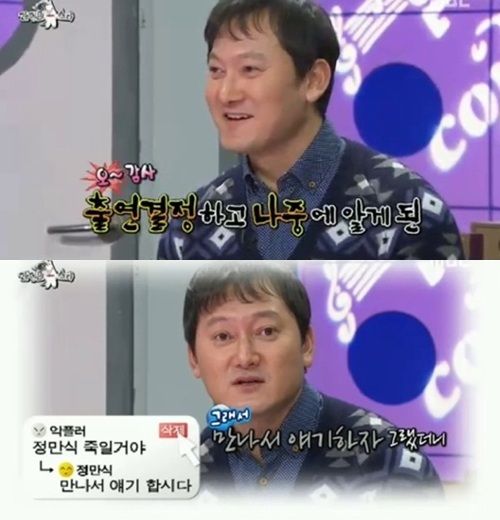 이날 정만식은 윤기원이 앞서 '라디오스타'에 출연해 밝혔던 요도파열 사건으로 인해 대신 '최고의 사랑'의 매니저 역으로 캐스팅 됐다는 사실을 전하며 “본의 아니게 감사했다. 대신 욕도 많이 먹었다. 홈피에 날 죽이겠다는 댓글을 달렸다. 만나서 얘기하자고 했더니 삭제됐다. 감사했다. 평생 처음 그런 댓글이 달려봤다”고 말해 웃음을 자아냈다.