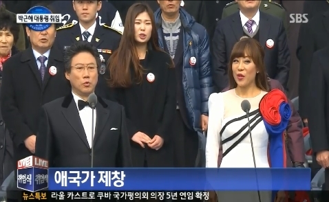 [ SBS SBS연예뉴스 | 김재윤 선임기자] 소프라노 조수미가 25일 오전 열린 제 18대 박근혜대통령 취임식에서 태극기를 디자인한 드레스를 입고 바리톤 최현수와 함께 애국가를 제창해 눈길을 끌었다.