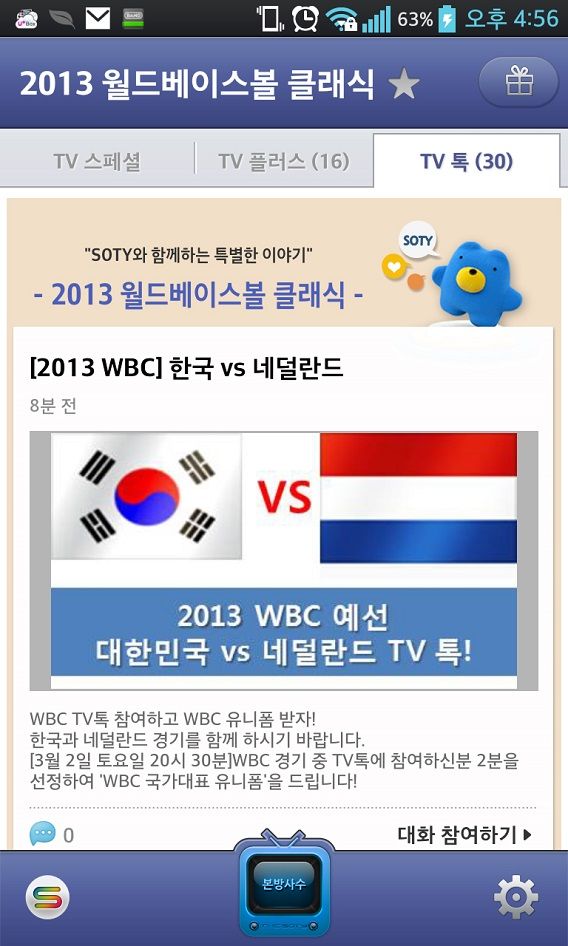 지상파 최초의 소셜 TV어플인 SOTY는 WBC TV톡을 통해 WBC를 시청중인 다른 이용자들과 실시간으로 경기 응원을 펼치면서 공감대를 형성할 것으로 보인다. 또한 TV스페셜에서는 실시간으로 야구관련 뉴스를 제공해 모바일로 쉽게 볼 수 있도록 했다.