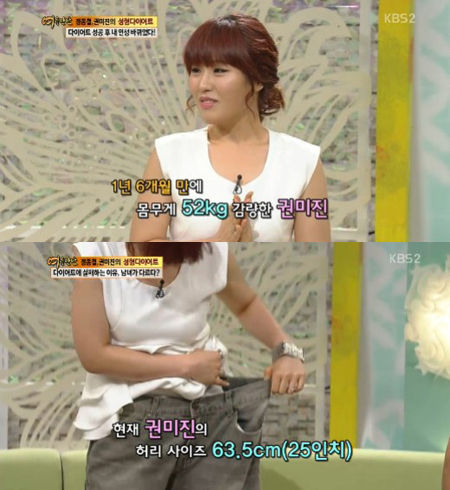 이날 방송에서 권미진은 과거 자신이 입었던 바지를 가지고 등장해 실제로 입어보며 완전히 달라진 허리사이즈를 공개했다.