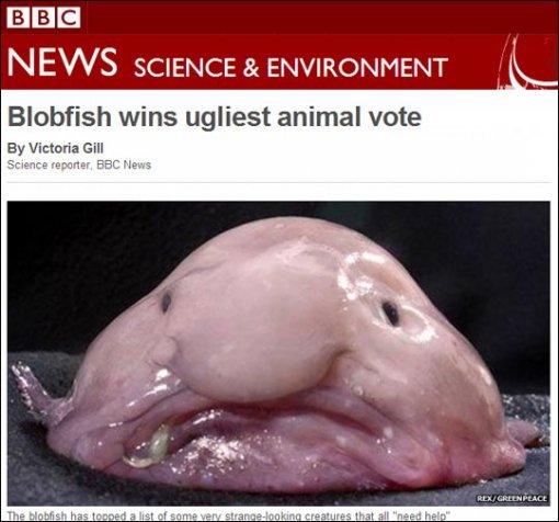 현지시각으로 지난 12일 영국 공영방송 BBC는 이색단체인 '못생긴 동물 보호 협회(The Ugly Animal Preservation Society)'가 세상에서 가장 못생긴 동물로 '블롭피쉬'를 선정했다고 전했다.