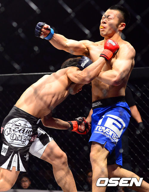이날 경기에서 초반 다소 불안한 모습을 보였지만 1라운드 종료 1분여를 남기고 상대 다카야 츠쿠다의 안면을 향해 오른손 강펀치를 날렸다.