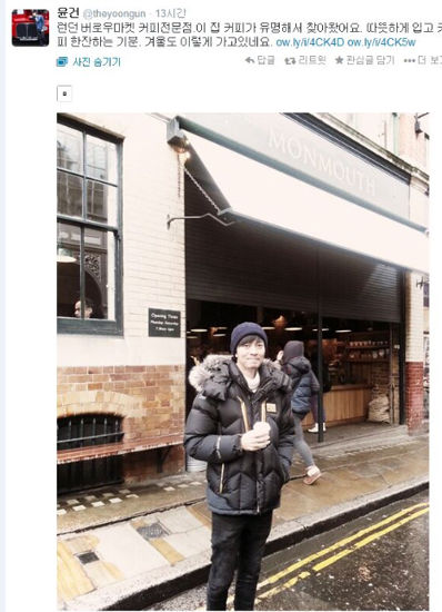 윤건은 18일 오전 자신의 SNS를 통해 “런던 버로우 마켓 커피전문점. 이 집 커피가 유명해서 찾아왔어요. 따뜻하게 입고 커피 한잔하는 기분. 겨울도 이렇게 가고 있네요”라는 글과 함께 해당 커피숍 앞에서 찍은 사진도 함께 공개했다.