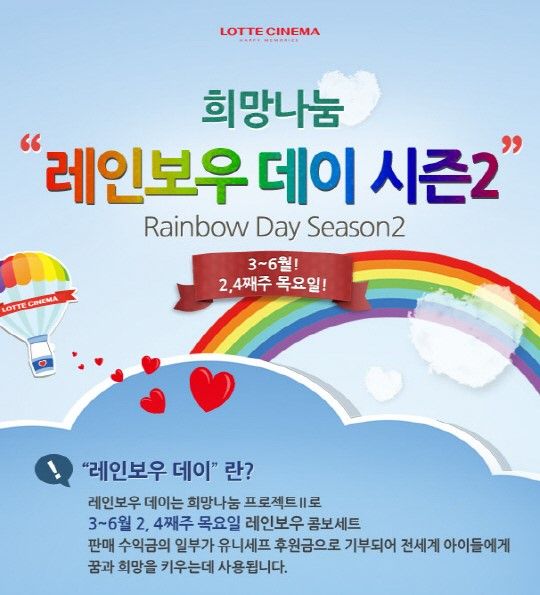 [SBS연예뉴스 | 김지혜 기자] 롯데시네마가 3월 27일부터 매월 2,4째주 목요일에 희망나눔 프로젝트인 '레인보우 데이 시즌2'를 진행한다.