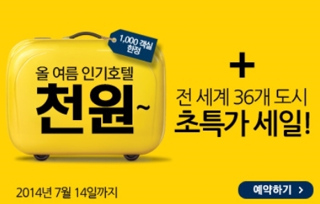 천원 호텔 프로모션은 세계 8개 도시에 위치한 호텔의 1000개 객실을 천원에 예약할 수 있는 이벤트로, 매주 화요일 오후 2시에 주차 별로 다른 도시의 호텔 예약이 오픈 된다. 지난 20일 첫 프로모션 도시로 부산의 천원 호텔 예약이 진행되어 인기리에 마감됐으며, 오늘 27일에는 서울호텔의 예약이 시작됐다.