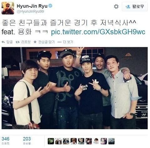 류현진은 27일(한국시각) 트위터를 통해 "좋은 친구들과 즐거운 경기 후 저녁식사, feat. 용화"라는 글과 함께 사진 한 장을 게재했다.
