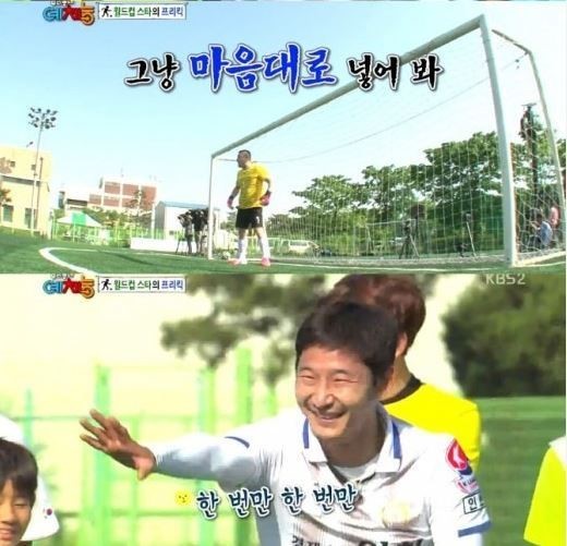 이날 이천수는 골키퍼 역할을 맡은 강호동을 상대로 프리킥에 나섰다.