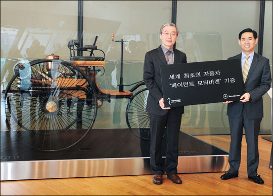 메르세데스-벤츠코리아는 한·독수교 130주년을 기념해 '세계 최초의 자동차' 페이턴트 모터바겐(Patent Motorwagen)을 서울시 산하 서울디자인재단에 전달했다고 밝혔다.