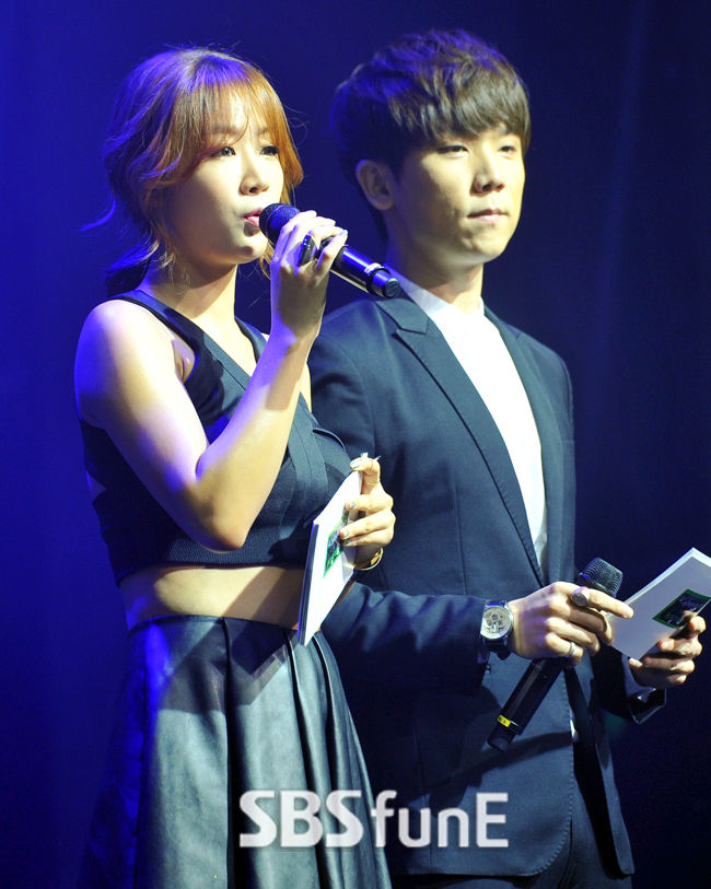 [SBS연예뉴스 | 김현철 기자] MC 소유-정기고가 9일 오전 서울 광진구 광장동 악스코리아에서 열린 보이프렌드 'OBSESSION PREMIERE SHOWCASE'에서 사회를 보고 있다.