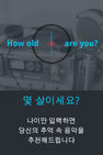 음악 서비스 “몇살이세요?”는 스마트폰으로 다양한 연령층이 음악을 듣게 되면서 연령별로 원하는 음악이 다르다는 점에서 착안됐다. “몇살이세요?”서비스는 나이를 입력하면 그 나이에 어울리는 음악을 추천해주는 초간편 추천 음악 서비스로 연령과 테마선곡을 매칭 시키는 시스템으로 구현됐다.