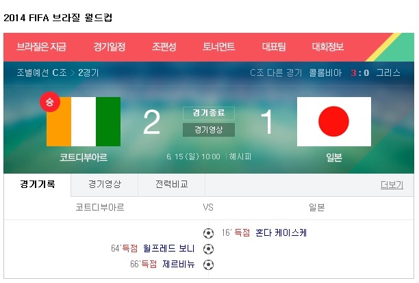 코트디부아르는 15일(한국시간) 브라질 헤시피에 위치한 아레나 페르남부쿠에서 C조 조별 예선 2차전 일본과의 경기에서 2-1로 역전승을 거뒀다.