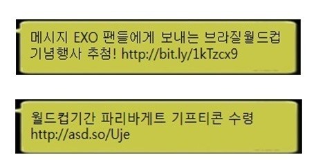 브라질 월드컵을 사칭한 스미싱 문자에 강성주 정보화전략국장은 "월드컵 경기 승패 소식, 골 명장면, 축하 경품 지급 등 월드컵을 사칭한 스미싱이 추가로 유포될 수 있으므로 의심스러운 문자를 받는 경우 인터넷주소를 클릭하지 말고 문자를 즉시 삭제해야 한다"고 당부했다.