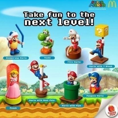 맥도날드는 슈퍼마리오 피규어를 맥도날드를 방문하는 어린이들을 위한 어린이용 '해피밀'세트로 구성해 햄버거와 디저트, 음료와 함께 해피밀 레드 박스에 담아 제공한다.