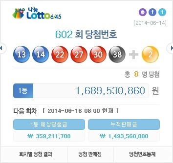로또602회당첨번호는 '13, 14, 22, 27, 30, 38'이며 보너스 번호는 '2'이다.