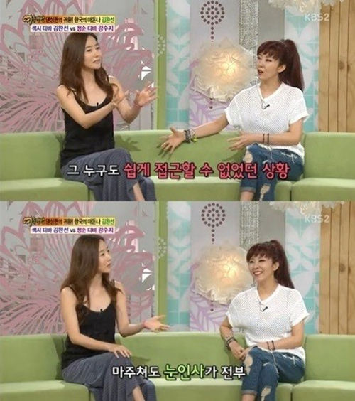 이날 방송에서 강수지는 "김완선이 늘 매니저이자 이모였던 한백희 씨와 있어서 이야기할 수 없었다. 그래서 눈이 마주치면 인사하는 정도가 끝이었다"고 말해 눈길을 끌었다.