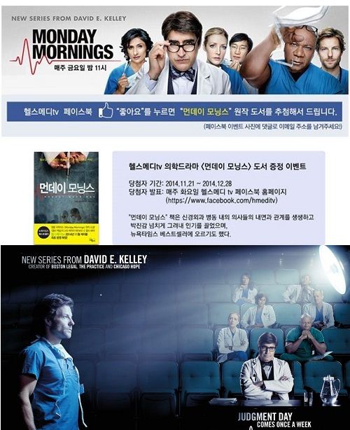 '먼데이 모닝스'는 산제이 굽타의 동명소설을 원작으로 해 지난 2013년 미국 TNT에서 방영된 10부작 메디컬 드라마다. 국내에서도 히트를 기록한 드라마 '엘리 맥빌'과 '보스턴 리걸'의 연출자 '데이비드 이 켈리'(David E Kelly)의 최신작이다.