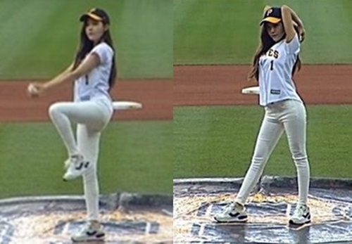 효민은 피츠버그 유니폼에 스키니진 차림으로 우월한 몸매를 뽐내며 마운드에 섰다.