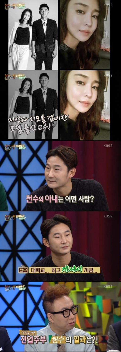 당시 이천수는 자신의 상황에 대해 "백수라 와이프가 돈을 번다"고 털어놨다. 이후 "부인은 어떤 일을 하느냐"는 박명수 질문에 "부인은 교수직이다"라고 답했다.