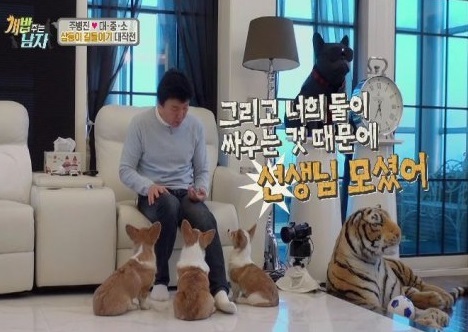 이날 주병진의 펜트하우스를 방문한 손님은 바로 애견 훈련사 이웅종 소장. 하지만 삼둥이가 이웅종 소장을 너무나 반갑게 맞이하자 소외감을 느낀 주병진은 어색함을 느끼는 듯한다.