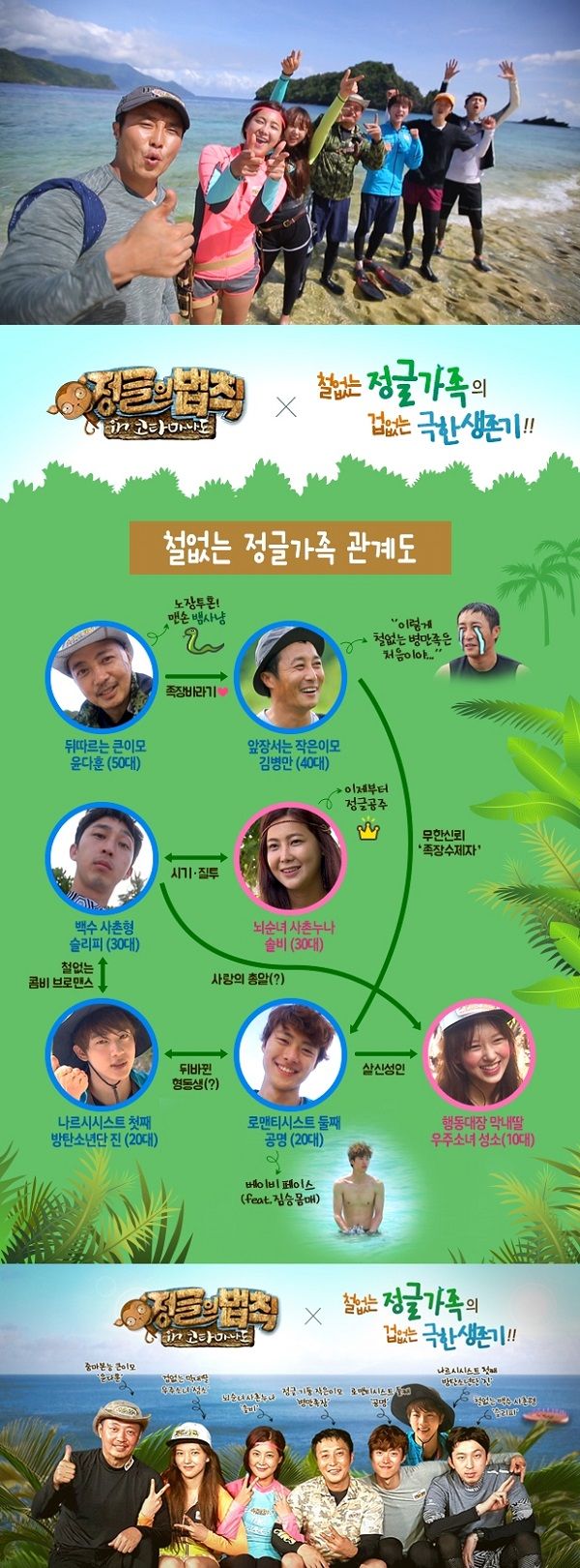 반 백살 윤다훈은 '정글' 역대 최고령임에도 불구 아줌마 같은 모습으로 큰이모가 됐고, 김병만은 철없는 가족을 이끄는 살림꾼 작은 이모다. 솔비는 정글 공주를 꿈꾸는 사촌 누나, 슬리피는 백수 사촌 형으로 이들 남매의 티격태격하는 모습을 보였다.