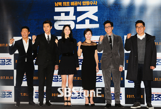 [SBSfunE 김현철기자]10일 오후 서울 성동구 행당동 왕십리 CGV에서 열린 영화 '공조' 언론시사회에서 출연 배우들이 포즈를 취하고 있다.
