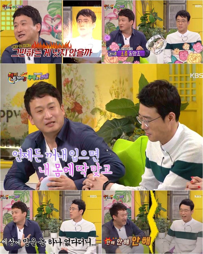 지난 12일 밤 방송된 KBS 2TV ′해피투게더3′(이하 '해투3')는 박수홍-윤정수, 서경석-이윤석이 출연한 '해투동:예능클리닉-우정과 전쟁'과 타이거JK-윤미래-김연자-한동근이 출연한 '내 노래를 불러줘:노래방 세대공감 1탄'으로 꾸며졌다. 이 가운데 '예능클리닉-우정과 전쟁'에서는 '브로맨스 시조새' 서경석-이윤석 콤비가 썸과 쌈을 오가는 알콩달콩한 우정 토크로 믿고 보는 '개그콤비'라는 사실을 재확인시켰다.