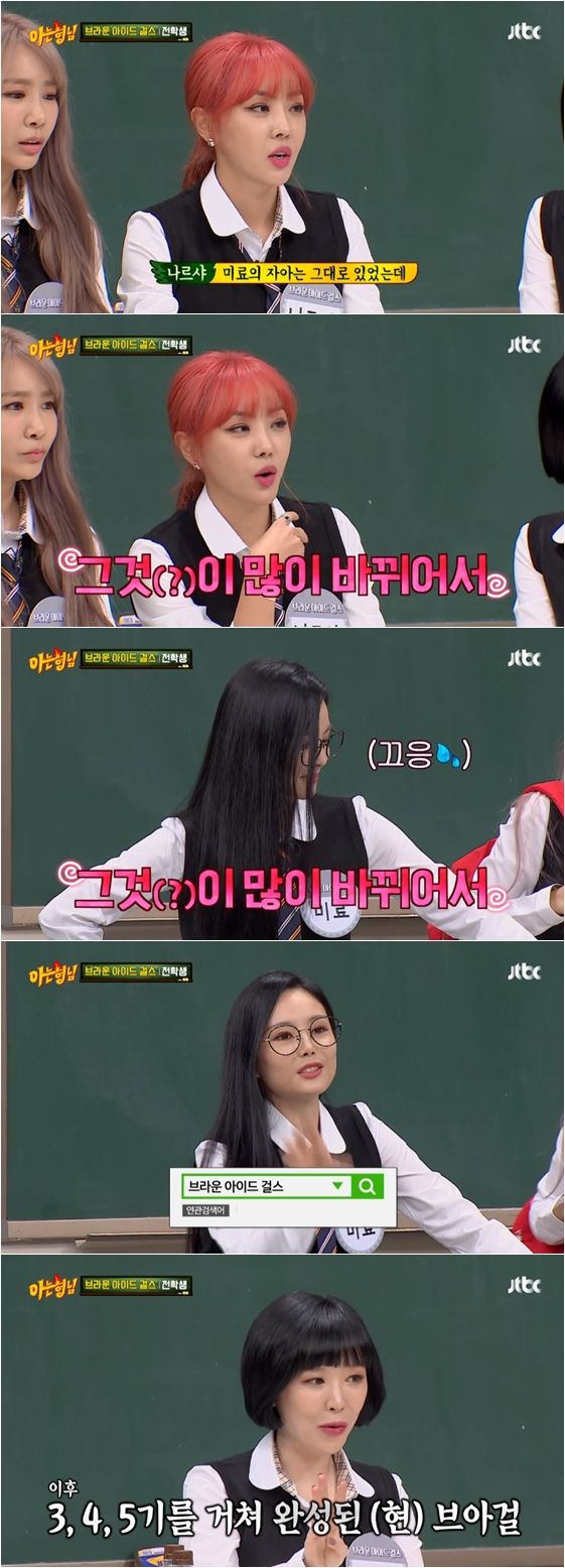 나르샤는 "미료의 자아는 그대로 있는데, 미료의 그것(얼굴)이 많이 바뀌어서. 사람들이 브아걸 멤버가 교체가 됐다고 하더라"며 미료의 성형을 짚어 웃음을 자아냈다.