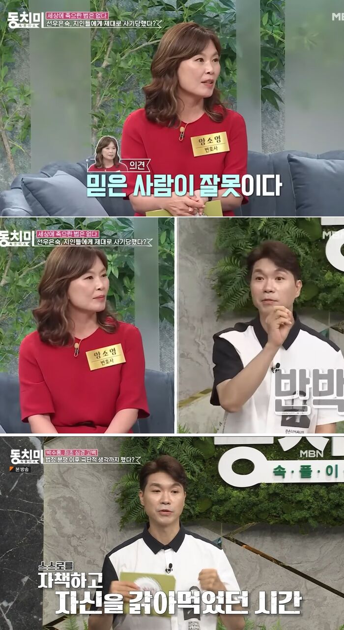 [SBS 연예뉴스 ㅣ강경윤 기자] MBN '속풀이쇼 동치미'에 출연한 양소영 변호사가 "사기는 믿은 사람들이 잘못"이라고 발언했다가 시청자들로부터 비판을 받았다.