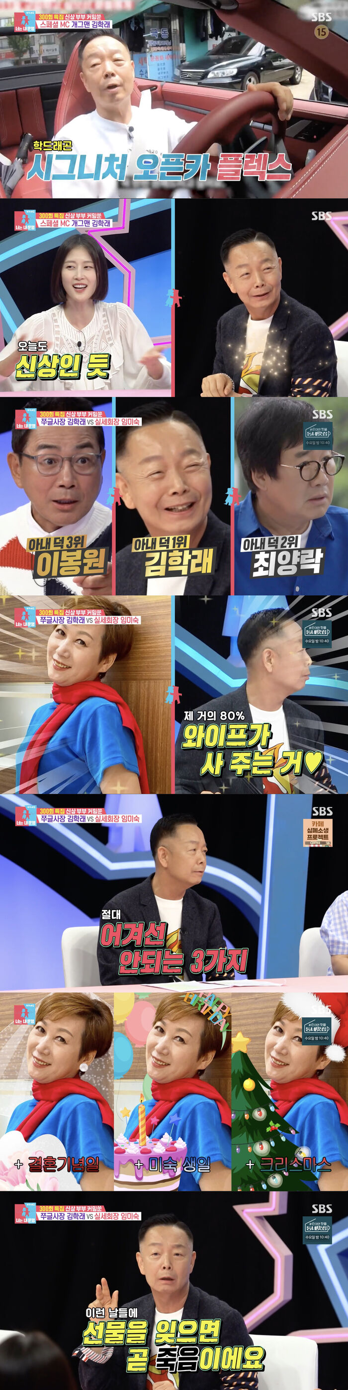 이어 김학래는 자신이 입는 옷의 80% 이상을 와이프가 사준다고 밝혀 모두의 부러움을 한 몸에 받았다. 또한 그는 스포츠카가 갖고 싶어 아내를 설득해 선물 받았다고 말해 눈길을 끌었다.