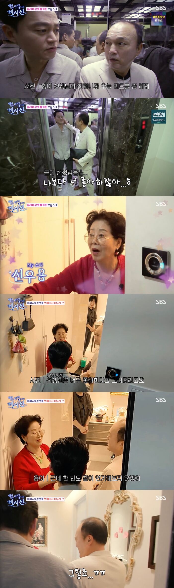 비서진은 마이 스타에게 깍듯하게 인사를 했고, 선우용여는 "웰컴 투 마이 하우스"라며 두 사람을 반갑게 맞이했다.