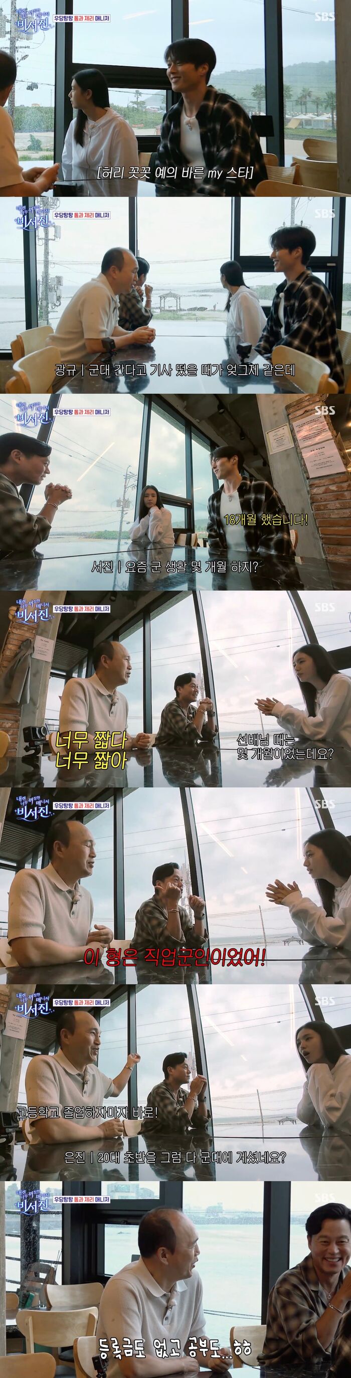 이를 보던 안은진은 김광규에게 몇 개월 동안 군대를 다녀왔는지 물었다. 이에 이서진은 "이 형은 직업군인이었다. 중사 출신이야"라고 말했다. 그러자 김광규는 68개월 군복무를 했다고 밝혀 모두를 놀라게 했다.